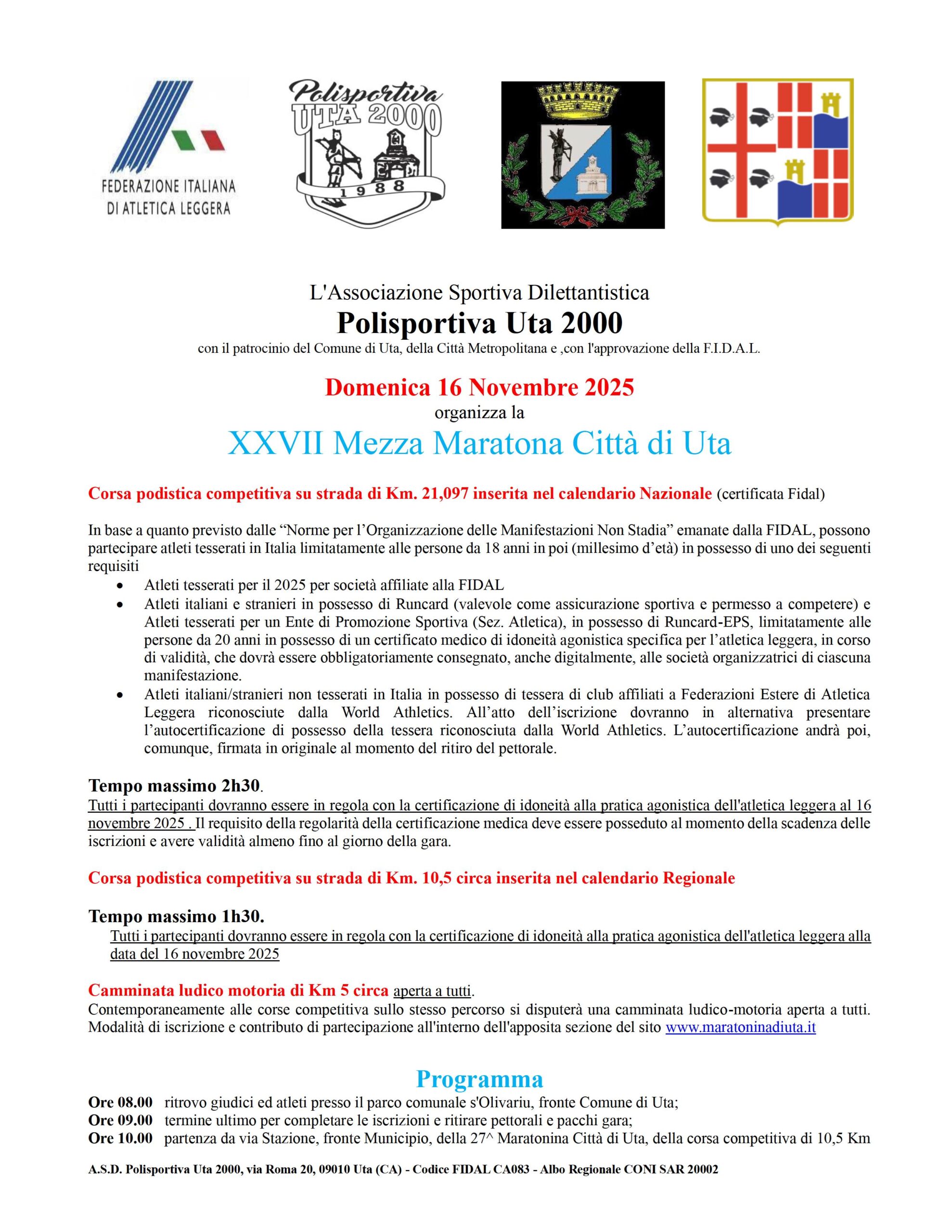 L’Associazione Sportiva Dilettantistica Polisportiva Uta 2000 con il patrocinio del Comune di Uta, della Città Metropolitana e ,con l’approvazione della F.I.D.A.L.